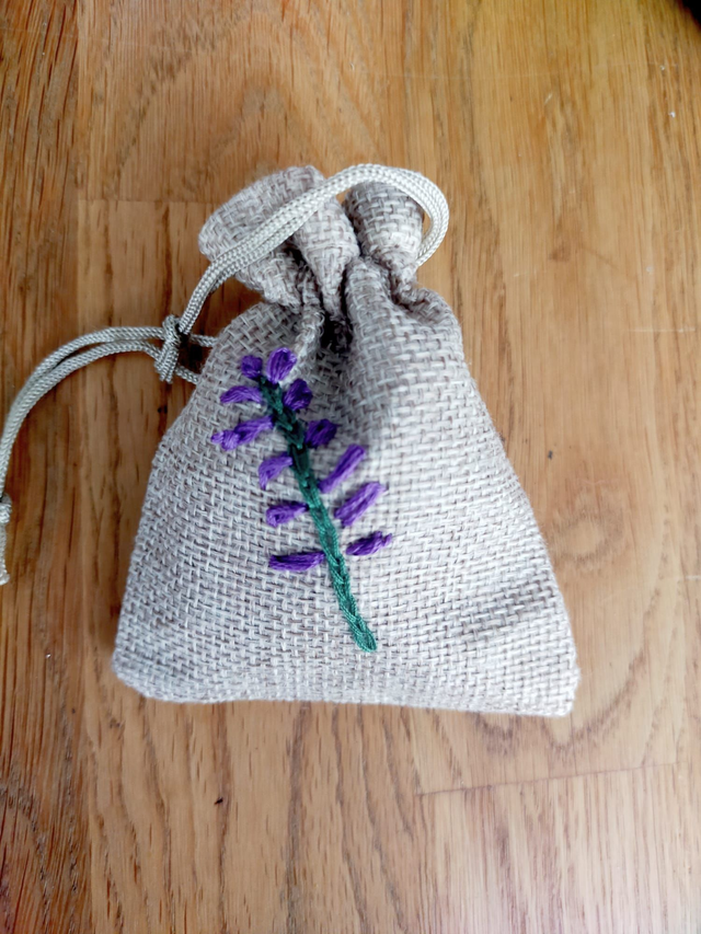 Small Hessian bags hand embroidered containing dried lavender hand picked from garden.