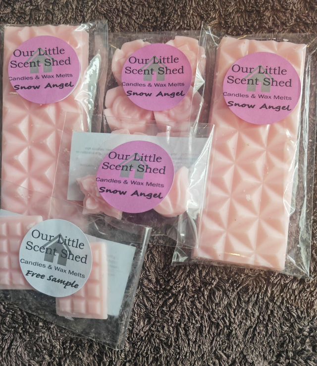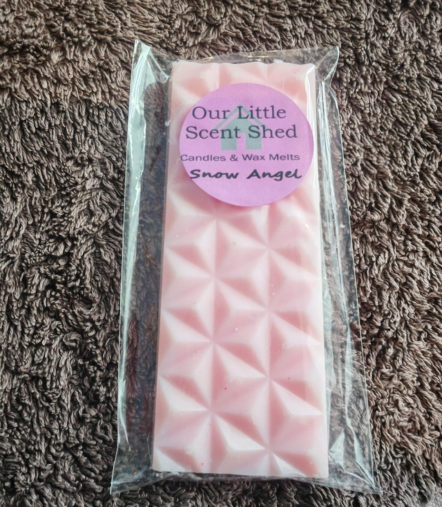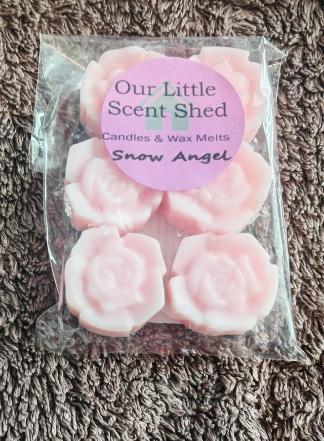 Our Snow Angel Wax Melts have a sweet, creamy fragrance starting with fruity top notes of banana, cherry, and peach. Followed by floral middle notes of rose, orris and jasmine. Leading to woody bottom notes of vanilla, musk and complex white woods.