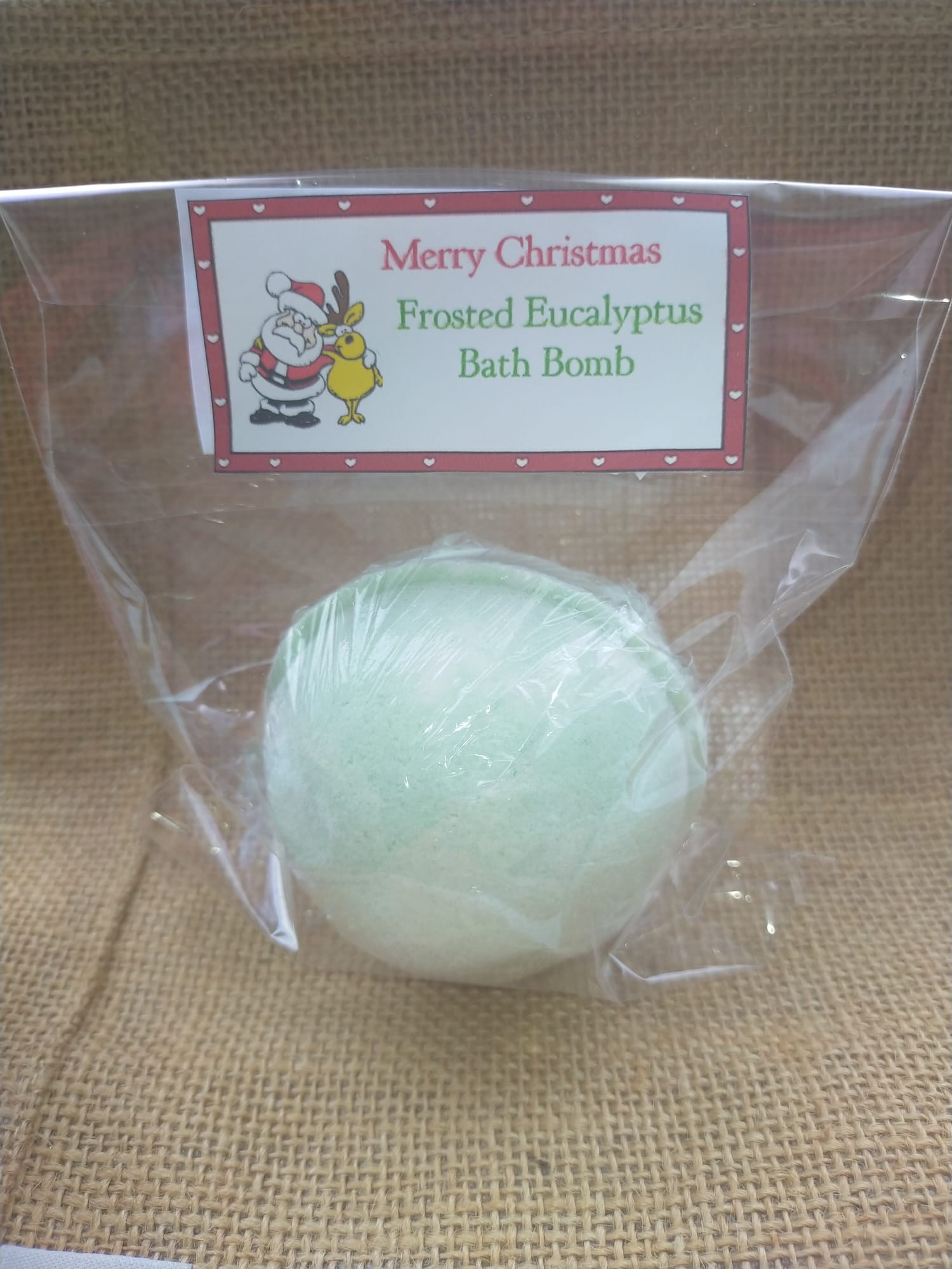 Our Frosted Eucalyptus Bath Bombs are based on a very popular laundry fragrance. This scent is both fresh and wintery. With top notes of fresh mint leading to a base of citrus and wintery pine, followed with bottom notes of soft honey.