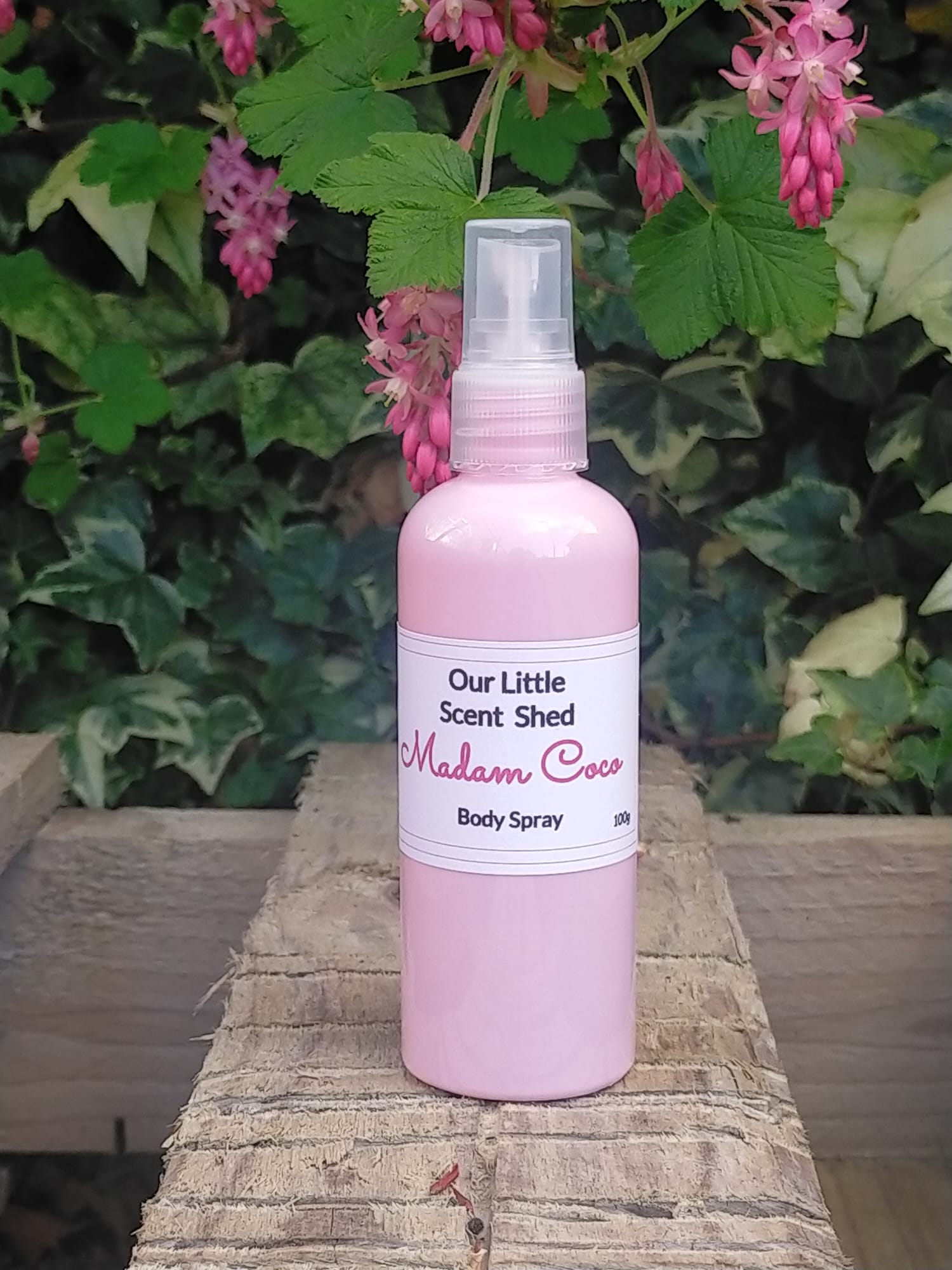 Our Madam Coco body Sprays are scented to remind you of your favourite perfume. A complex, fruity fragrance with top notes of citrus, orange and lime. Herbal, floral middle notes of jasmine, lily of the valley and rose. Musky bottom notes of patchouli, vanilla, tonka bean, and complex white woods.