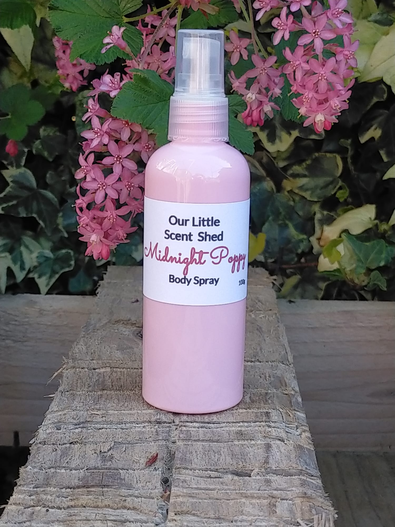 Our Midnight Poppy body sprays are inspired by a well-known perfume offering a clean fragrance with fruity top notes of lime and orange. Followed by the floral & herbal middle notes of jasmine, orchid and rose. Entwining with woody bottom notes of vanilla, amber and complex white woods.