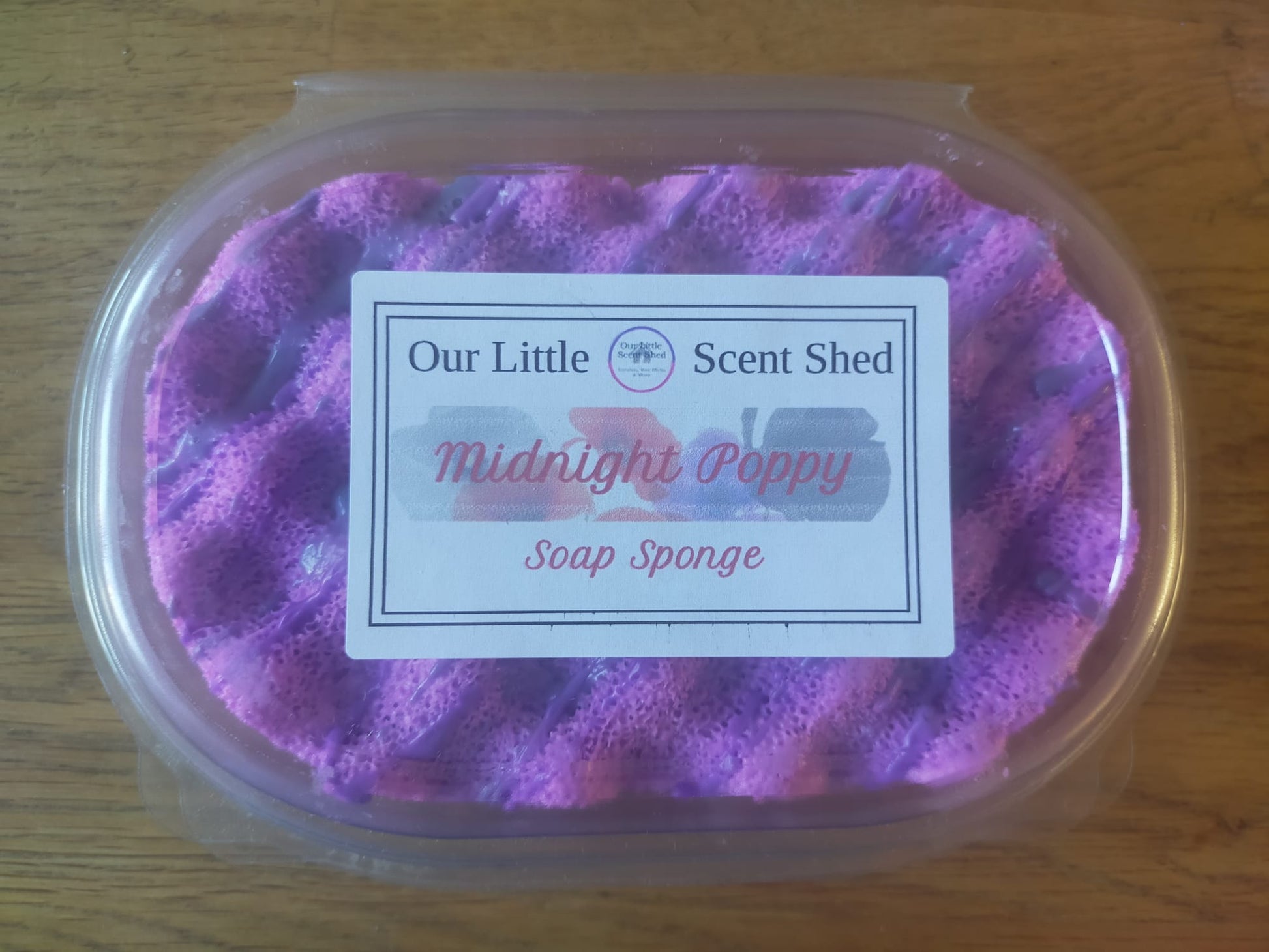Our Midnight Poppy soap sponges are inspired by a well-known perfume offering a clean fragrance with fruity top notes of lime and orange. Followed by the floral & herbal middle notes of jasmine, orchid and rose. Entwining with woody bottom notes of vanilla, amber and complex white woods.